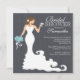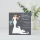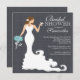 O convite para chá de casamento de noiva Na moda moderna apresenta uma noiva moderna chic brindando com um copo de vinho enquanto segura um belo buquê de flores para casamentos azuis turquesas definidas em um papel impresso em fundo de linhagem preta popular, com texto branco destacado. Nosso chá de panela moderno de noiva é perfeito para uma celebração popular de chás de panela de vinho. Visite nosso compro para ver este belo chá de panela em uma grande seleção de cores de buquê floral e diferentes variações de noiva.