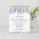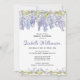 O design floral romântico apresenta uma asteria púrpura e azul esfregando graciosamente a sua vinha. A videira e apenas algumas flores armam o fundo do convite. As mesmas duas fronteiras estão na parte de trás do chá de panela. Uma coroa de wisteria está no centro com os nomes dos casais de casamento. Há um fundo púrpura/azul macio no verso e branco na frente. Você também pode mudar essas cores para coordenar com a decoração do casamento.