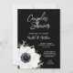 Uma flor esbelta e branca de anêmona e folhas sobre fundo negro é perfeita para um chá de casamento, um convite, um convites de chá de panela ou qualquer evento especial, que apenas muda a redação. CORRESPONDENTE a itens na nossa coleção.