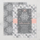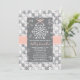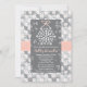 Um belo floco de neve tem chá de panela ou convite para chá de casamento com uma prata gelada, cinza e uma borda sutil branca, borda floral e floco de neve com um design impresso de fita colada rosa. Um floco de neve branco bonito atado por um delicado arco rosa claro pende do topo da carta com reflexos de neve em forma de coração atrás dela. A parte de trás do convite tem um coração repetitivo e um padrão de floco de neve. Trabalho de arte © Chrissy H. Estúdios, LLC. Todos os direitos reservados.
