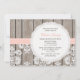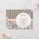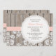 convites de chá de panela de fita e de rendas, com uma vedação de madeira impressa, cabeça de prego, uma fita de rosa claro com tons quentes e grão de madeira e um fundo de aparência de rendas damascos, são perfeitos para um chá de casamento de jardim de madeira, fazenda ou campo. Criado e projetado por Chrissy H. Estúdios, LLC. Todos os direitos reservados.