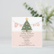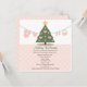 Uma árvore de Natal decorada com enfeites de coração rosa com uma estrela no topo e uma linha de roupa de bebê atrás dela adornam estes convites de chá de bebê de Natal bonitos e preciosos para uma menina. Uma adorável calcinha rosa e sapatinhos de bebê e um babador pendem atrás da árvore. Clique no link a seguir para ver todas as nossas obras originais de Chrissy H. Arte e ilustração © Chrissy H. Studios, LLC. Todos os direitos reservados.