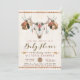 Convites de chuvada de bebê tribal para meninos com pena boho e caveira de veado com contas e flechas em um fundo de madeira rústica. Você pode personalizar facilmente este convite de chuvada de bebê tribal para meninos para o seu evento, simplesmente adicionando seus detalhes.