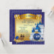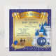Convites de chuvada de bebê príncipe azul royal e dourado com adorável príncipe bebê étnico afro-americano em uma linda almofada dourada em um belo castelo azul royal e dourado e fundo de carruagem real. Estes convites de chuvada de bebê príncipe azul royal e dourado são facilmente personalizados para o seu evento, bastando adicionar os seus detalhes.