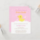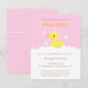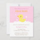 Um convite de chuveirinho de bebê de um patinho amarelo adorável para convidar os convidados para celebrar com a futura mamãe. Muitas bolhas de chuveiro e um fundo de azulejos cor-de-rosa doce em uma parede de banheiro. Doce e adorável! Personalize facilmente com os detalhes da sua festa.