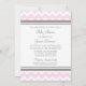 Convites personalizados para bebês em elegantes e modernos, cor-de-rosa claro, cinzas e padrão zigzags de chevron branco. Personalizável com seu texto, entre em contato conosco para solicitar uma alteração de cor.