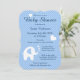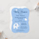 Chamadas de duche de bebê azul e branco elegantes com elefante giro. Festa personalizada convida com pequenos corações e animal engraçado. Design neutro para rapazes e raparigas. Forma de recorte de colchete personalizável. Cor de fundo personalizada com bolinhas. Ou seja, amarelo, cinza, azul-lacre, roxo ou rosa. Linda tipografia de na moda com ícones de amor bonitos e padrão de polkadot. Modelo personalizável com RSVP e linha do registro. Doces cartões de duche para seu pequeno príncipe ou princesa. Designs de papel clássico para mulheres grávidas / mãe para ser.