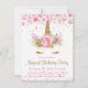 Convites de festas de aniversários de Unicórnio com um rosto de unicórnio floral cor-de-rosa e bonito com pestanas de ouro bonito e chifre floral num fundo de bolhas de bolha elegante e pastel. Este convite de aniversário unicórnio fofo é facilmente personalizado para o seu evento simplesmente adicionando os seus detalhes. Você também pode alterar a cor de fundo e remover o plano de fundo no verso deste adorável convite unicórnio. Este é um design impresso sem brilho real.