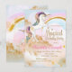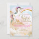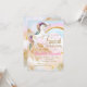 Convites de festa de aniversário de unicórnio com lindo unicórnio rosa, roxo e azul-teal e arco-íris em um belo fundo de nuvem dourada. Este lindo convite de festa de aniversário de unicórnio mágico com arco-íris pastel é facilmente personalizado para o seu evento, basta adicionar os detalhes do evento no estilo de fonte de sua escolha. Você também pode alterar a cor do fundo. Este é um design impresso sem brilho real.