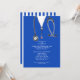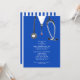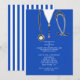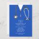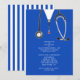 Convites criativos de festa de formatura de medicina com aventais de hospital azuis e estetoscópio. Edite o texto para criar um convite de formatura de médico único ou anúncio de graduado em medicina.