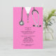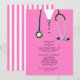 Convites criativos de festa de formatura de faculdade de medicina com aventais de hospital rosa e estetoscópio. Edite o texto para criar um convite de festa de doutor único ou anúncio de formatura de faculdade de medicina.