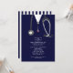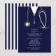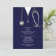 Convites criativos de festa de formatura de faculdade de medicina com aventais de hospital e estetoscópio. Edite o texto para criar um convite de festa de doutor único.