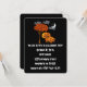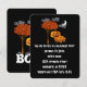 Convite de Halloween com Céu Preto, Lua Crescente, Nuvens e Família de Abóboras Fofofas ao lado de uma árvore com Folhas de cor laranja de outono e um BOO grande no verso com olhos sobre as letras, todos convidando você para uma Festa de Colheita de Halloween mais mas não muito assustadora. Perfeito também para a Festa de Colheita de Halloween da Igreja!