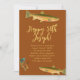 Convites de festa de aniversário para homem adulto para um pescador. Design de truta pontilhada e isca de pesca com mosca em papel de cor marrom enferrujado com texto amarelo claro. Personalize facilmente com o nome dele, em letra cursiva negrito, no topo. Todas as informações da festa são adicionadas em forma de parágrafo. Escolha opções de impressão e/ou download. O verso é de cor amarela sólida.