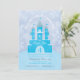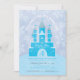 Convites de aniversário de princesa personalizados. Um castelo de princesa de inverno congelado com "Era uma vez, numa terra distante..." e o nome da princesa e a idade que ela está a imprimir abaixo, juntamente com todos os detalhes da festa.