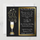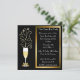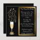 Convites de festas elegantes da véspera de ano novo do preto e do ouro. Gráficos de um vidro do champanhe, com um arco goldtone na haste e nos sparkles que disparam fora da parte superior do vidro, contra um fundo preto. Uma caixa de texto moldada goldtone no lado direito do convite tem o texto branco customizável. Personalize para dizer que qualquer coisa que você deseja. Grande convite de vista por uma noite memorável.