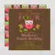 Comece sua quarta festa de aniversário com nossos adoráveis convites de festas aniversários de criança de coruja rosa e vermelha. Convite perfeito para a sua festa de 4 anos! Nossos convites para corujas doces apresentam uma coruja bonita sentada em um galho de folhas verdes com flores e é colocada sobre um fundo marrom-na moda. Nosso convite à festa de aniversario de meninas da coruja apresenta um histórico único de coruja. Visite o nosso compro por correspondência. Obrigado, cartões de nota, adesivos de aniversário, obrigado que você tenha adesivos e selos postais. © Petit Tatti