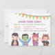 Um convite bonito e colorido para o período do Dia das Bruxas de outubro! Tem crianças vestidas com figurinos de Halloween como vampiro com caixa de suco, monstro com roupas cortadas, bruxa com varinha e gato preto e lobisomem com camiseta lua crescente. Ao contrário, há um padrão de listras verdes e laranja inclinadas. Personalize facilmente com os detalhes de sua parte em modelos de texto fornecidos.