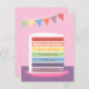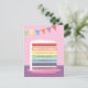 Tenha uma celebração colorida do aniversário começar com este convite de aniversário à moda, elegante e na moda. Características que de design uma fatia alta de bolo do arco-íris com cada camada como o espaço para a personalização do partido detalha. As bandeiras coloridas da estamenha estão pendurando no fundo com padrões diferentes como círculos, diagonais e linhas. Bolinhas cor-de-rosa para o fundo. Design feminino e doce que é grande para meninas e adultos do aniversário!