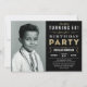 Convites de festas de aniversários adultos com design de brilho preto e ouro. Carregue sua foto antiga e personalize o texto para qualquer idade.