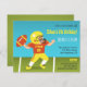 Comece com este convite de aniversário americano brilhante e colorido do futebol! Ele tem um garoto fofo em engrenagens de futebol que consistem em capacete amarelo, camiseta laranja com ombros e calças e calçados correspondentes. Ele está em posição de jogar o futebol laranja escuro em sua mão para a vitória. Um tema de excelente para aniversários que amam ou gostam de jogar futebol americano! Personalize facilmente com os detalhes da sua festa, incluindo o nome na camiseta e número do garoto!