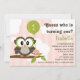 Uma coruja marrom bonito guardara um balão verde do aniversário ao sentar-se empoleirado em um ramo frondoso com um cupcake cor-de-rosa do chocolate do glacé em um envoltório amarelo em um dia nebuloso macio em um fundo listrado cor-de-rosa. Você pode personalizar este cartão para dizer o que quer que você gosta. Pode ser personalizado com o nome e idade da menina do aniversário. Os trabalhos de arte e o design nestes caçoam e os convites das crianças são © Chrissy H. Estúdio, LLC. Todos os direitos reservados.