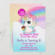 Cute Chibi Unicorn sentado numa nuvem com balão e cupcake com convites de festas de aniversários arco-íris.