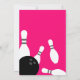 Modelo de Convites de festas de aniversários cor-de-rosa neon. Convites modernos com bolas de boliche pretas e pinos de boliche branca. Personalize com seu próprio nome e texto. Atividade divertida para crianças e adultos. Fundo de cor rosa ou personalizado. Vamos se diverte!