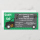 Uma convite de aniversário para uma festa de videogame ou de caminhoneiros de jogos. O design apresenta um caminhão de jogos preto e cinza, controlador de vídeo game, bastão de jogo ou controlador remoto. O fundo é um padrão geométrico em tons de verde. O texto diz "Game On!" "Jamison Andrews atingiu o Nível 8". Personalize este convite para o seu filho ou festa de aniversário.