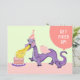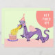 A festa do dragão de aniversário criativo convida com um dragão engraçado rosa e roxo que respira fogo.