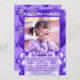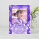Convite de aniversário infantil com balões roxos design e um lugar para sua foto. Diversão, texto branco impresso diz, "Parabéns" no topo. O nome dela está em grande impressão abaixo do modelo de foto. Todas as informações da parte estão em um parágrafo abaixo da foto. O verso do convite contém mais balões em um pequeno padrão. Este design também está disponível como download instantâneo e pode ser compartilhado on-line.