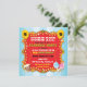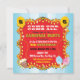 Convites de festas de aniversários de carnaval super fofos com um grande letreiro vermelho, balões, pipocas e algodão doce com tipografia circense divertida contra um fundo de barraca azul listrada. Excelente para um menino ou menina e não muito jovem. Ilustração desenhada à mão por McBooboo.