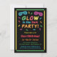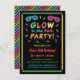 Jogue uma experiência original da festa de aniversário para seus convidados! Este fulgor colorido no convite de festas escuro tem o fulgor nos quadros dos vidros escuros e em uma variedade das varas de néon da cor que contrastam agradàvel com o fundo preto. No reverso é um teste padrão colorido das listras do fulgor. Note que o convite é um design digital do falso e não incandescerá na obscuridade. Personalize facilmente com seus detalhes do partido de aniversário de criança. Tema do divertimento para os meninos do aniversário e as meninas, adolescentes das idades aos adolescentes! O fulgor do texto no partido escuro não é editável.
