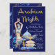 Noites árabes convites de festas com belas ilustrações azuis e douradas sobre um fundo azul real. Esta maravilhosa festa de aniversário da noite árabe e este convite para eventos é facilmente personalizado para o seu evento simplesmente adicionando os seus detalhes. Você também pode alterar a cor de fundo. Este é um design impresso sem brilho real, folha de alumínio, etc.