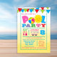 Convite de festas de piscina da garota com texto colorido e borda em fundo amarelo de cor-de-água. Esta convite de festas divertida e festiva de piscina é facilmente personalizada para o seu evento, simplesmente acrescentando seus detalhes. Você pode remover o plano de fundo e adicionar a cor de sua escolha.
