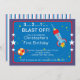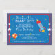 Comece seu partido de aniversário de criança fora do direito com nosso convite bonito do aniversário do espaço que caracteriza um foguete para soprar fora com os planetas ajustados em um fundo dos azul-céu com estrelas. A parte traseira do convite caracteriza um fundo da listra azul. Bonito para sua festa de aniversário temático dos meninos do espaço. Visite nossa loja para ver o outro obrigado dos convites de festas de aniversários & da harmonização dos navios de espaço você notas, etiquetas & selos postais. Design de Blackleaf do ©