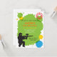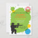 Os convites de festas de aniversários de um paintball que é grande para aniversários guardararam em locais de encontro do paintball. Caracteriza a silhueta preta de um artilheiro do paintball em uma posição da ocupa que toma o alvo sobre o rifle do paintball. O alvo está fechado ligada! Manchas e splats de pinturas verdes, amarelas e azuis para o fundo. Personalize facilmente com seus detalhes do partido no espaço verde.