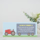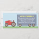 Um convite de aniversário longo com um trator vermelho puxando um trailer azul. Personalize os detalhes do seu partido no espaço do trailer! Excelente para aniversários que adoram veículos tratores!