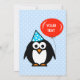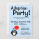 convites de festas de lançamento de adoção com desenho animado de pinguins e balão vermelho. Convites personalizados para ocasiões de chá de fraldas. Texto do anúncio personalizável e cor do plano de fundo. Plano de fundo azul feminino com padrão de bolinhas branco. Adote um modelo de criança para um menino ou menina.