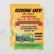 Convites de aniversário super legal de caça para aquela pessoa que ama jogos de vídeo. Feito em um estilo de poster vibrante com um fundo de explosão solar, veículo de caminhão de jogos com gráficos incríveis e muito espaço em ambos os lados para suas informações sobre o partido. Excelente para qualquer idade, aniversário ou mesmo eventos corporativos. Ilustração desenhada à mão por McBooboo.