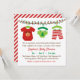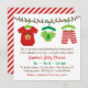 Um convite com roupas bonitinhas penduradas sobre luzes de Natal coloridas. As roupas incluem um criador de bebês de renas ruidosas vermelhas, uma fralda de bebê verde com árvore de Natal e um par de calças listradas vermelhas e brancas. Personalize facilmente com os detalhes do seu partido. Perfeito para chás de fraldas no inverno, na época de Natal de dezembro!