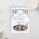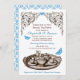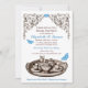 Os Convites de festas de chá de noz azul apresentam um conjunto de chá e borboletas com um cabeçalho de rolagem floral e padrões de ornamentado em azul, marrom e branco.