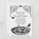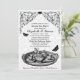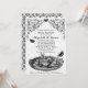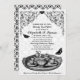 Os Convites de festas de chá de nozes de jardim preto apresentam um conjunto de chá e borboletas com um conector de rolagem floral e padrões de ornamentado em preto, marrom e branco.
