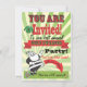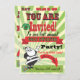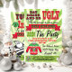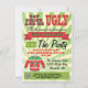 Festa de Natal de suéter feio e super divertida com uma sensação retrógrada. Inscrições modernas, faixas e um suéter feio contra um fundo de explosão solar. O verso é um excelente como a frente com a antiga arte de clipe do Retro Papai Noel e informações sobre a festa. Ilustração desenhada à mão por McBooboo. com