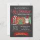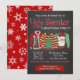 Convite de festas de Natal de suéter feio com três suéteres muito feios num quadro e fundo de flocos de neve. Você pode personalizar facilmente esses convites de festas de Natal de suéter feio e divertido para o seu evento simplesmente adicionando seus detalhes no estilo de fonte e na cor que você prefere.