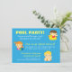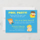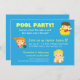 Convide familiares e amigos para uma sessão de relaxamento e diversão com este convite de festas colorido de piscina, perfeito para o verão! O convite para a festa de piscina tem um trio de crianças bonitas se divertindo na água azul legal com vários itens de piscina, como pato de borracha, bola de praia e boia. A página inversa tem um piscar bonito de borracha. Perfeito para quem planeja um aniversário em uma piscina de quintal ou piscina inflável, ou realiza o evento em um parque de atrações de água ou piscina de natação em clube. Personalize facilmente com os detalhes do seu partido.