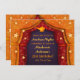 Um belo convite à noite árabe que apresenta uma cobertura vermelha e amarela que tem estrelas flutuando sobre ela. No meio do convite está uma lâmpada mágica que transmite mistério e mistério. O plano de fundo é uma cor roxa com um espaço para você escrever suas informações. Excelente para aniversários e outras celebrações.