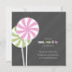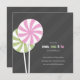 Convites de festa de aniversário Lollipop. Este design moderno e na moda apresenta dois idiomas em rosa e branco, e verde e branco contra um fundo de cinza com uma faixa diagonal sutil. Ideal para festas infantis com doces, guloseimas e diversão! Personalize facilmente as informações do seu próprio partido. Copyright © Lisa Marie Robinson. Todos os direitos reservados.