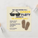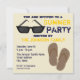 Um convite de festas de verão com uma ilustração de um par de óculos escuros no topo esquerdo e um par de chinelos marrons no canto inferior direito. Personalize o texto amarelo e azul escuro com detalhes de sua ocasião.