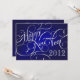 Convites de festas da véspera de Ano Novo -- Elegante e corajoso, mas divertimento e festivo no espírito -- Roteiro de prata extravagante com redemoinhos na moda corajosos no fundo azul da meia-noite. Estes na moda e design sofisticado podem facilmente ser personalizados para partidos de comensal formais ou celebrações ocasionais da casa aberta do feriado. Apenas incorpore sua informação para criar seu próprio original e na moda personalizado convida para todo o evento especial do ano novo. Selos postais, cartão, botões, etiquetas e presentes de harmonização disponíveis na galeria.